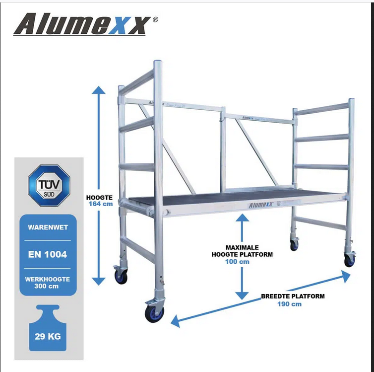 El andamio plegable de aluminio Basic X de ASC Spain soporta una capacidad de carga de 200Kg por metro cuadrado en la plataforma y 225Kg por rueda. Se trata de un andamio de aluminio plegable profesional tanto para interior como exterior muy manejable, gracias a su facilidad para moverlo mediante la ruedas y su peso ligero en todo el conjunto. Además este andamio es muy fácil de plegar, algo de gran utilidad para su almacenamiento fácil en cualquier garaje o almacén.